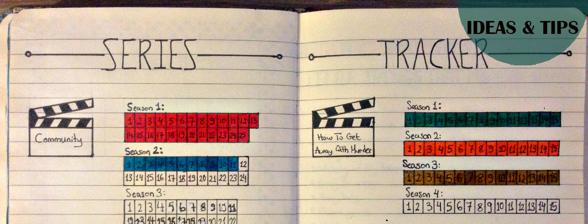 Basically, I drew movie clips and wrote the name of the series inside of them. Afterwards, I added tables and numbered the boxes based on the # of episodes that season had. This way, I just color a numbered box for every episode I watch! 😀