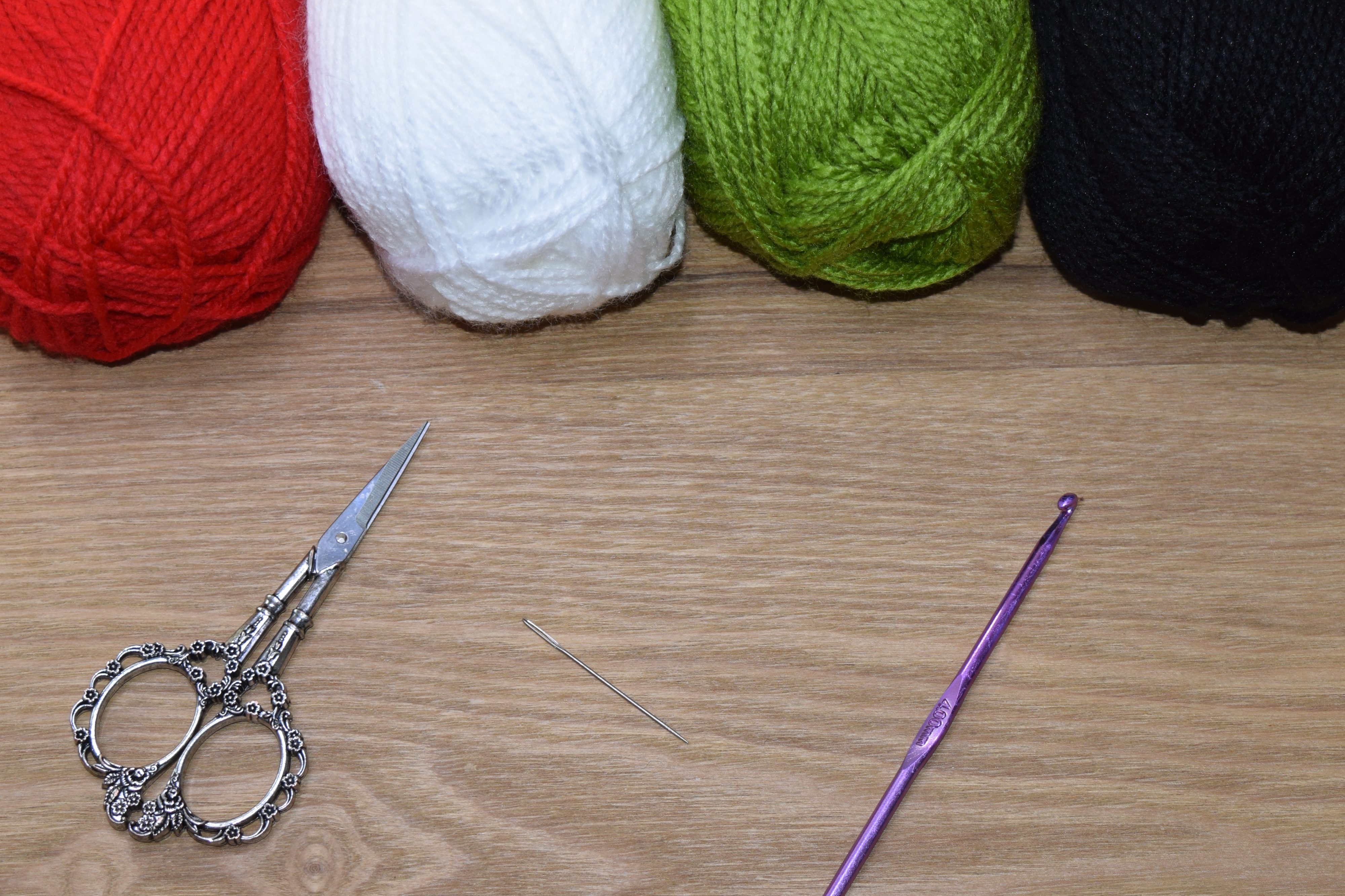 - Lightweight acrylic yarn in green, black, yellow, and red