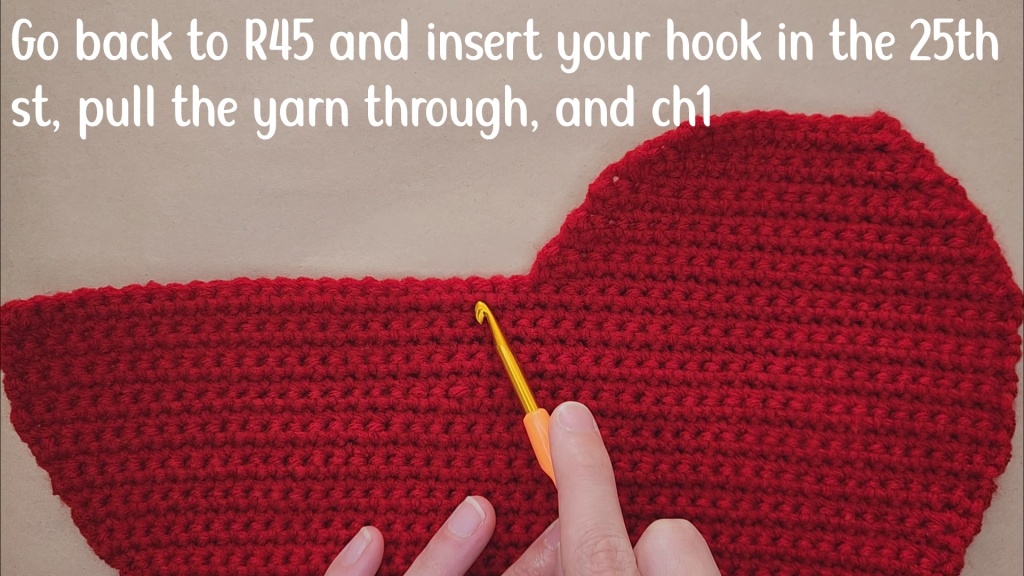 Go back to R45. Insert your hook in the st 25th st so that you can crochet from the center towards the edge.