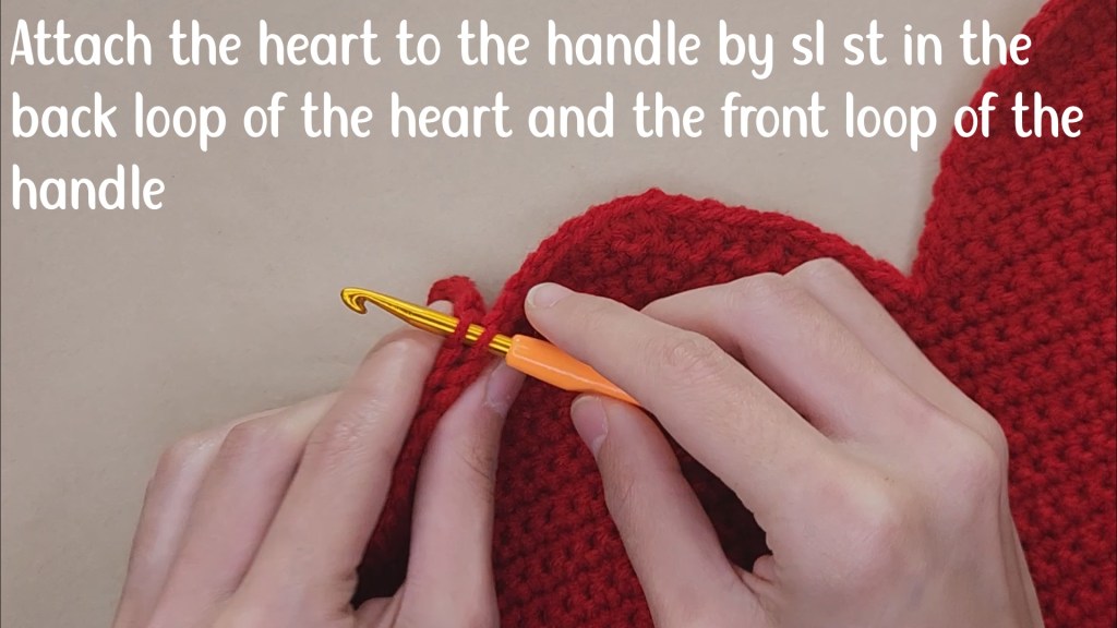 Ch1 and sl st all around the heart to connect the handle to the heart. You will sl st from one stitch market to the other. Once you reach the end, cut the yarn, and finish off.