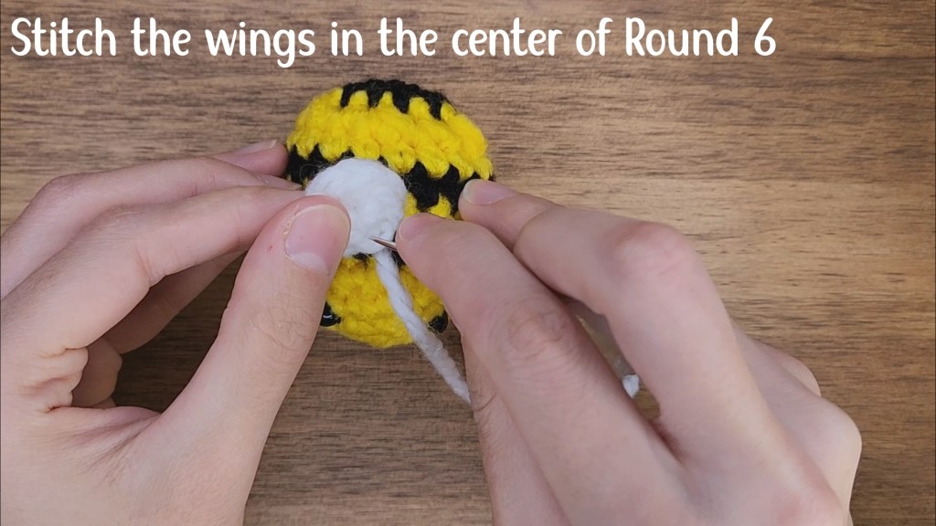 Stitch the wings in the center of Round 6 of the body of the bee.