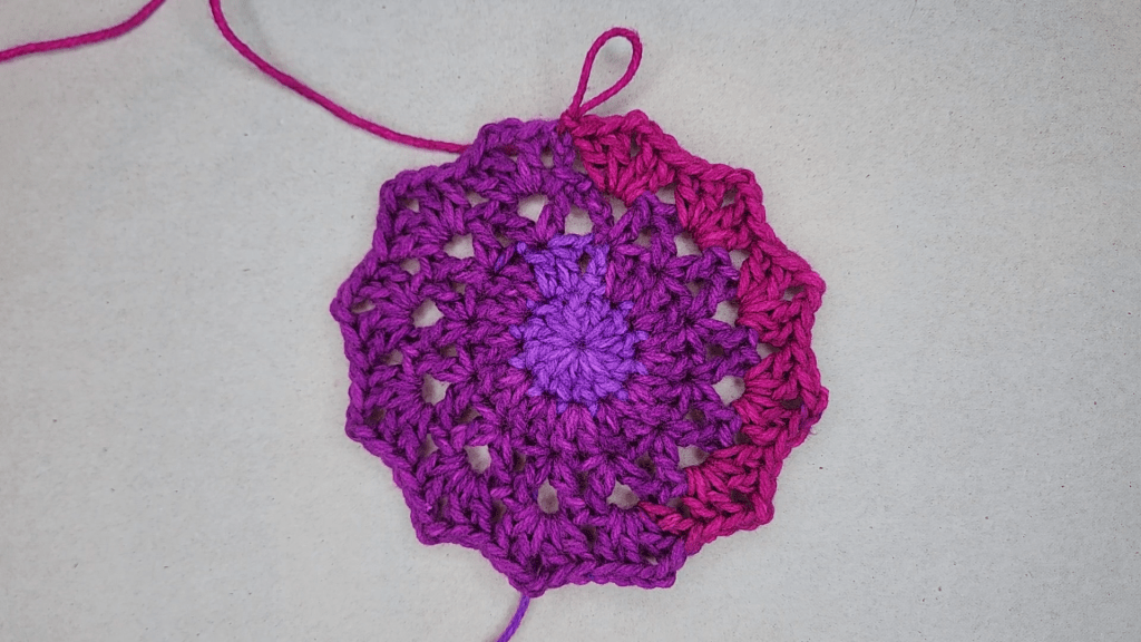 Moving forward, the pattern will have two normal rounds with the point of the star being [2dc, ch2, 2dc], followed by a decrease round with the point of the star being [dc, ch2, dc].